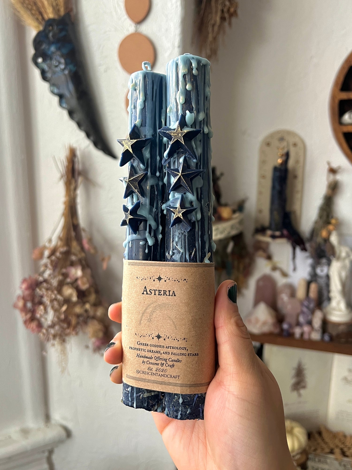 Here, this Asteria deity set has star wax charms, a customized kraft label with a falling star illustration, and gold mica powder dusted on the stars and inside the candle. When the candle burns, the mica powder will result in shimmery, reflective particles.