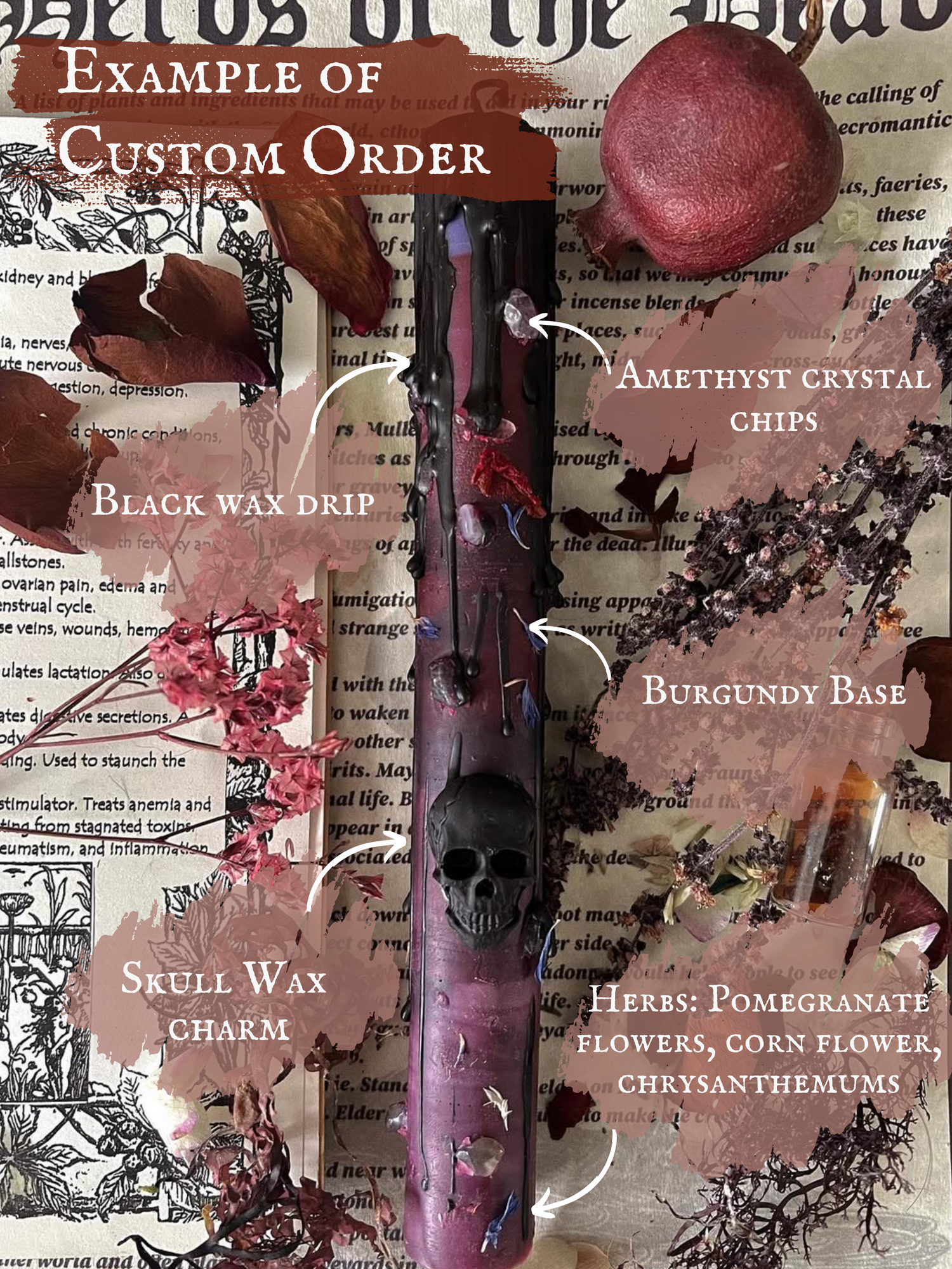 This Persephone pillar candle is a great example of what to include in your custom orders form.