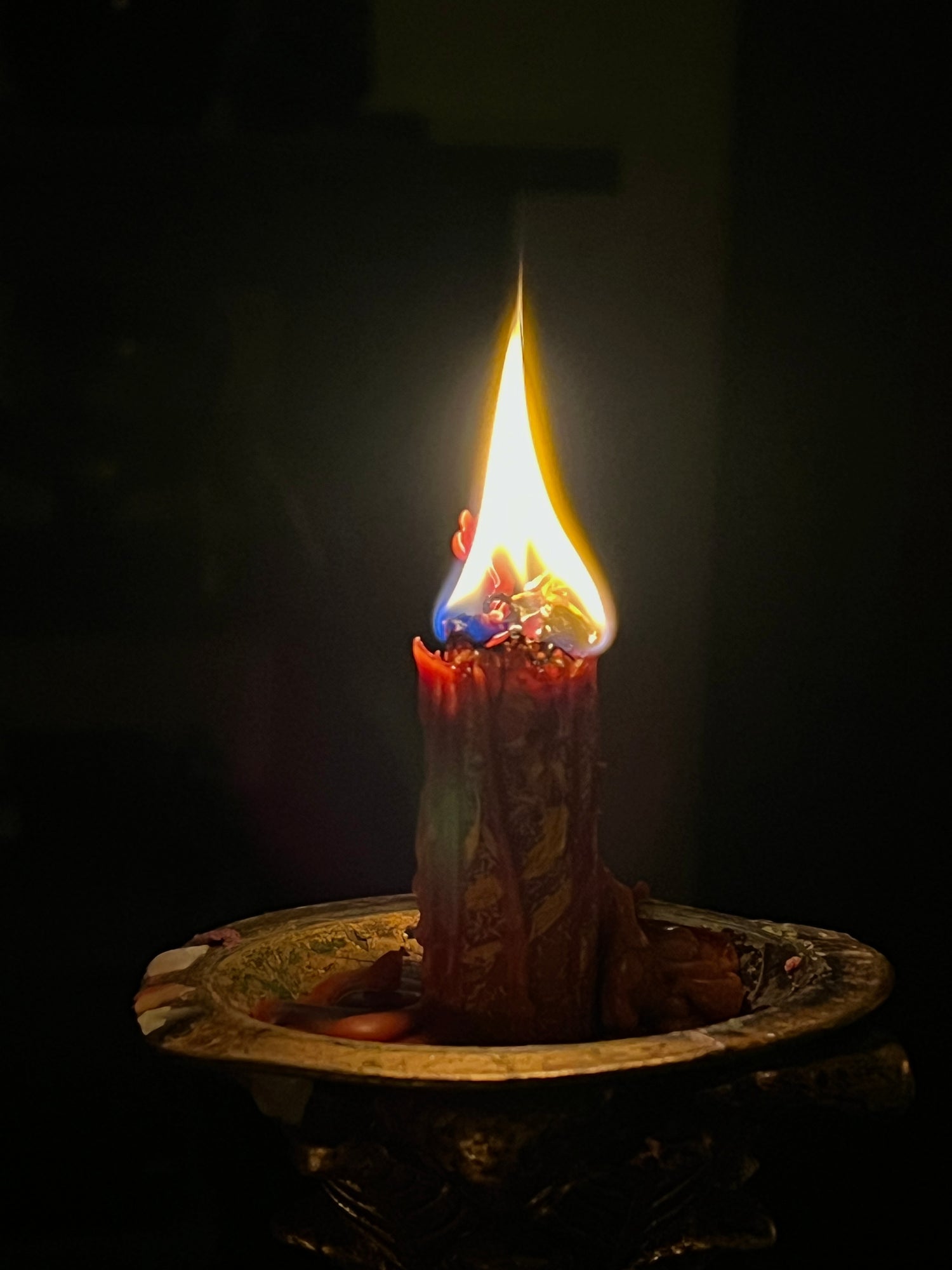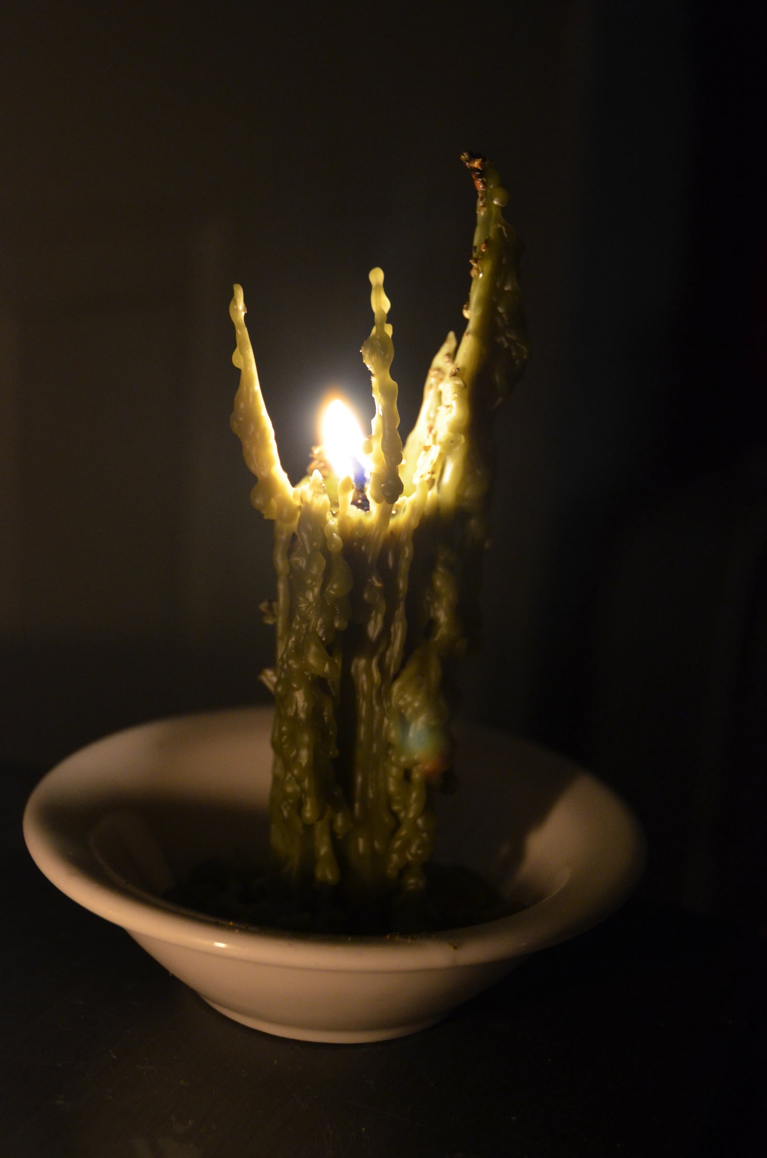 My ritual candles are fully dressed (although deity candles are only half-dressed) in a layer of herbs, which encourages both the dripping and a larger, more dramatic flame.