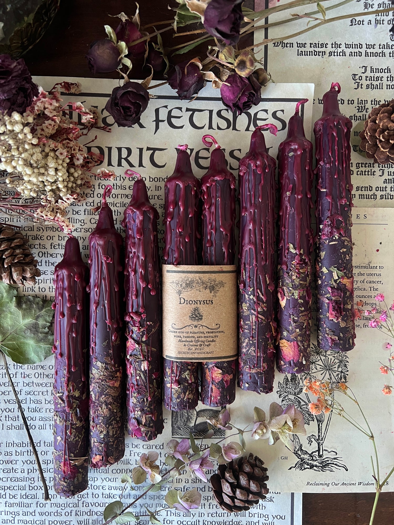 ɪᴛᴇᴍ ᴅᴇsᴄʀɪᴘᴛɪᴏɴ: Two 6 inch taper candles rolled in locally sourced herbs. These taper candles have been ritually rolled in herbs associated with Dionysus such as pine, damiana, rose, and bay leaves.