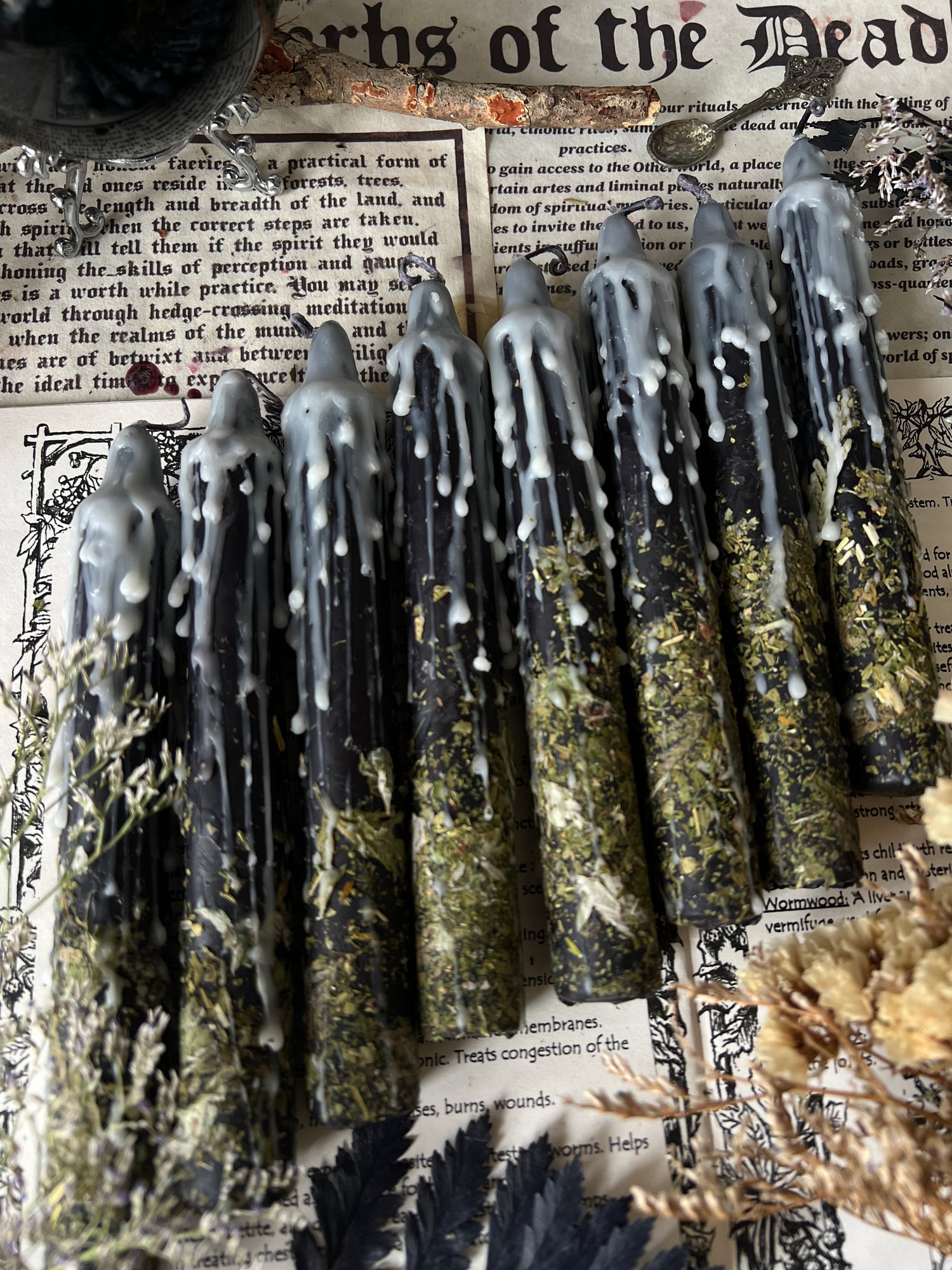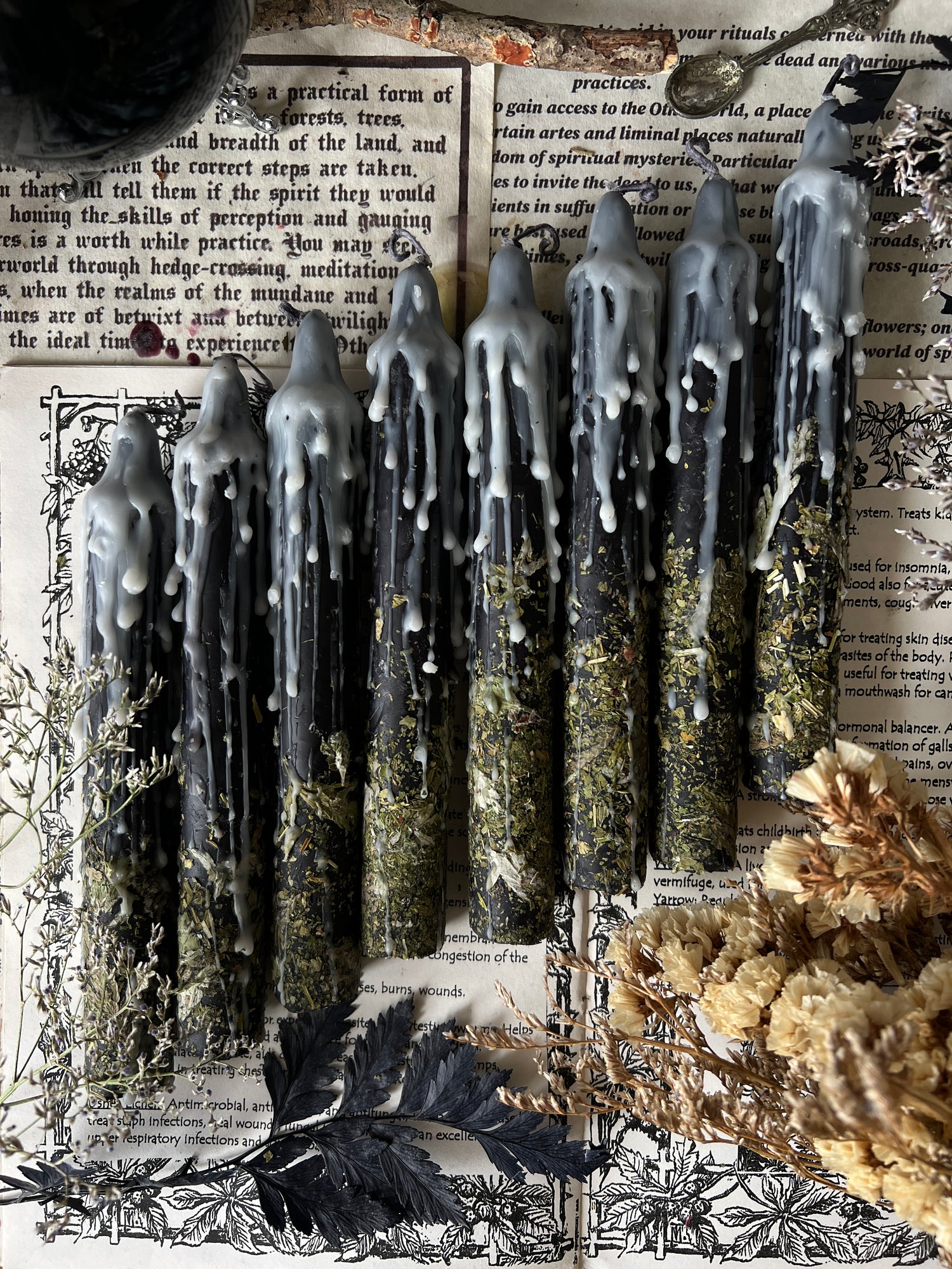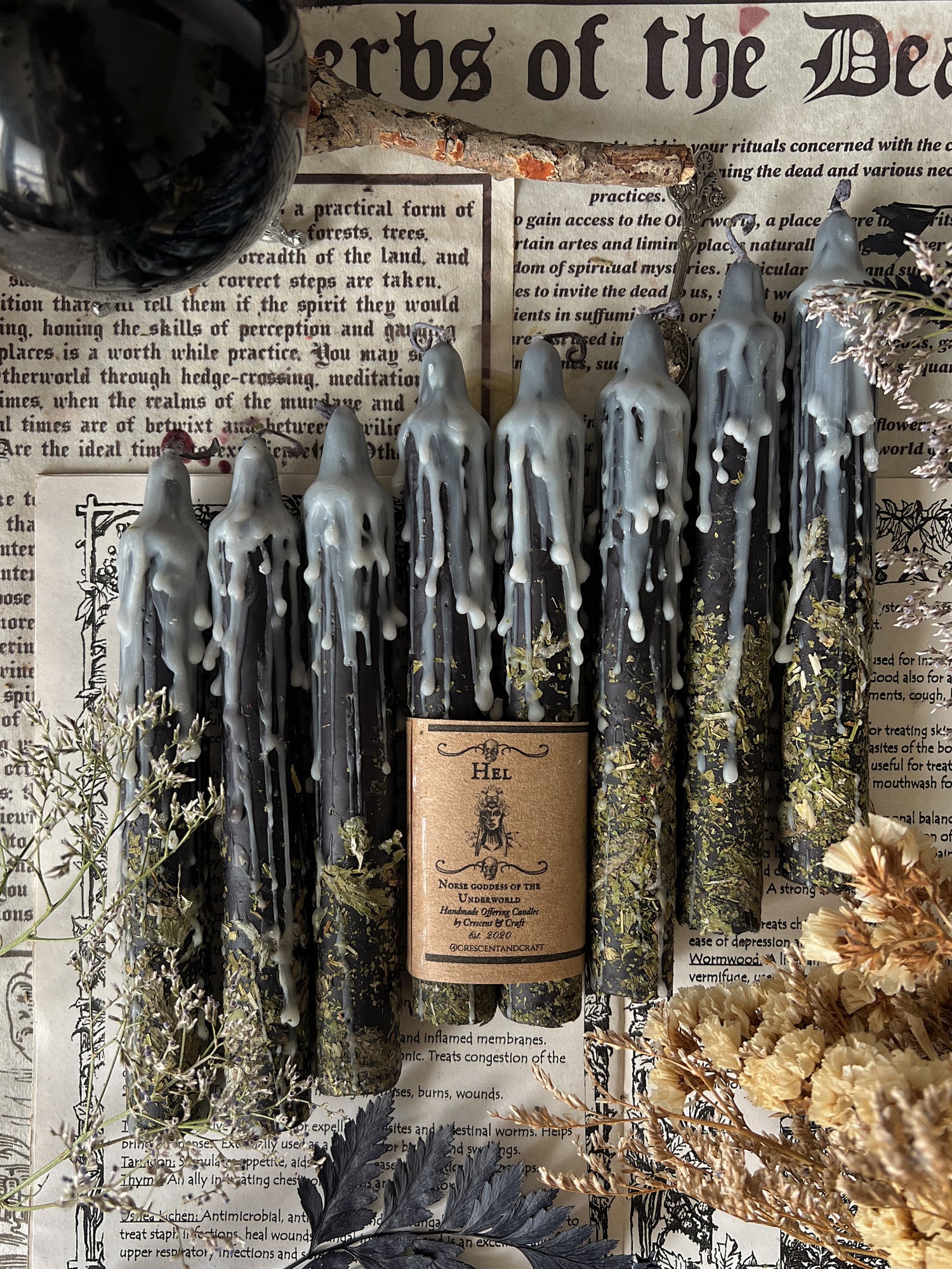 ɪᴛᴇᴍ ᴅᴇsᴄʀɪᴘᴛɪᴏɴ: Two 6 inch taper candles rolled in locally sourced herbs. These taper candles have been ritually rolled in herbs associated with Hel such as cedar, apple, wormwood, and mugwort.