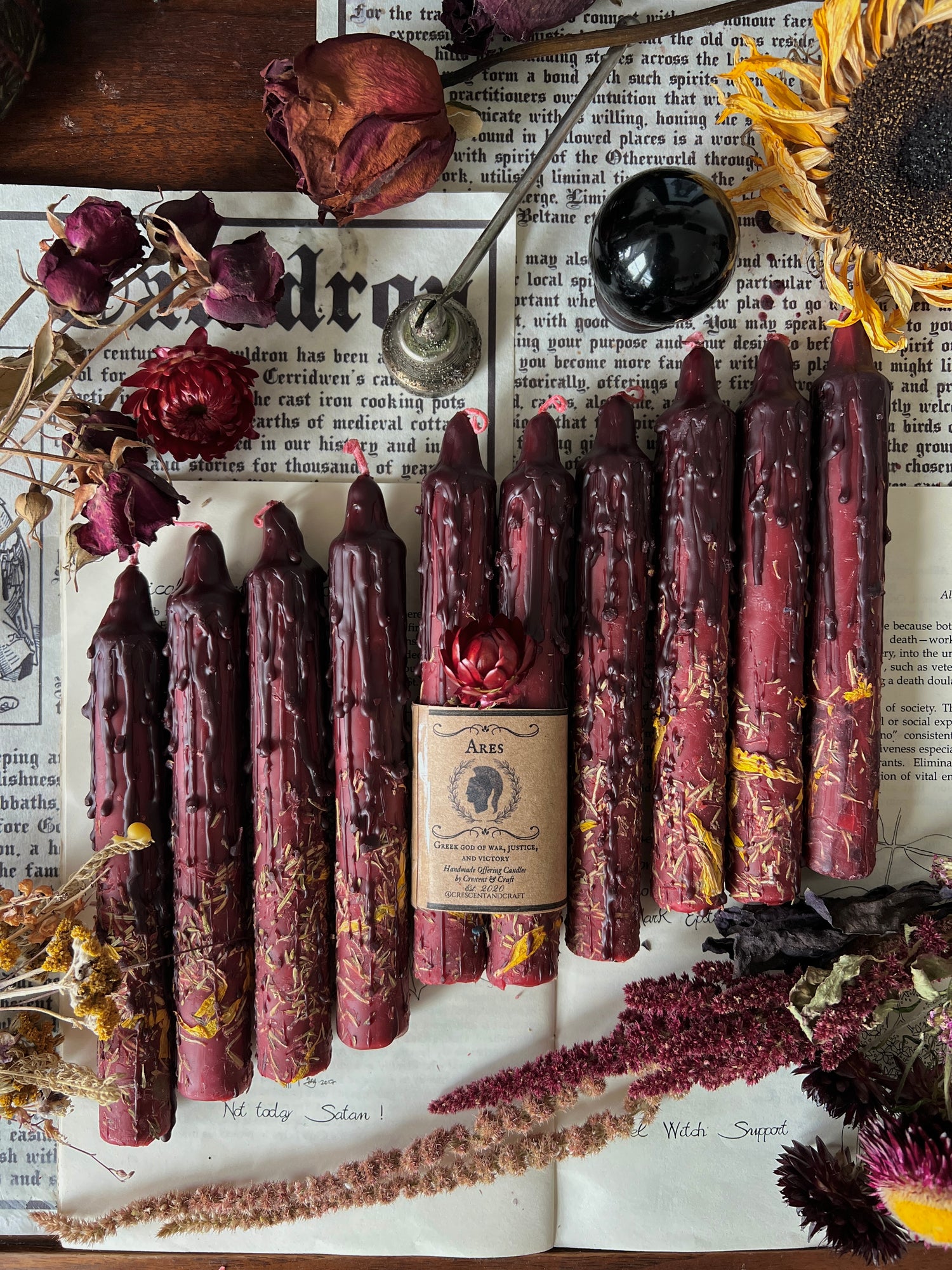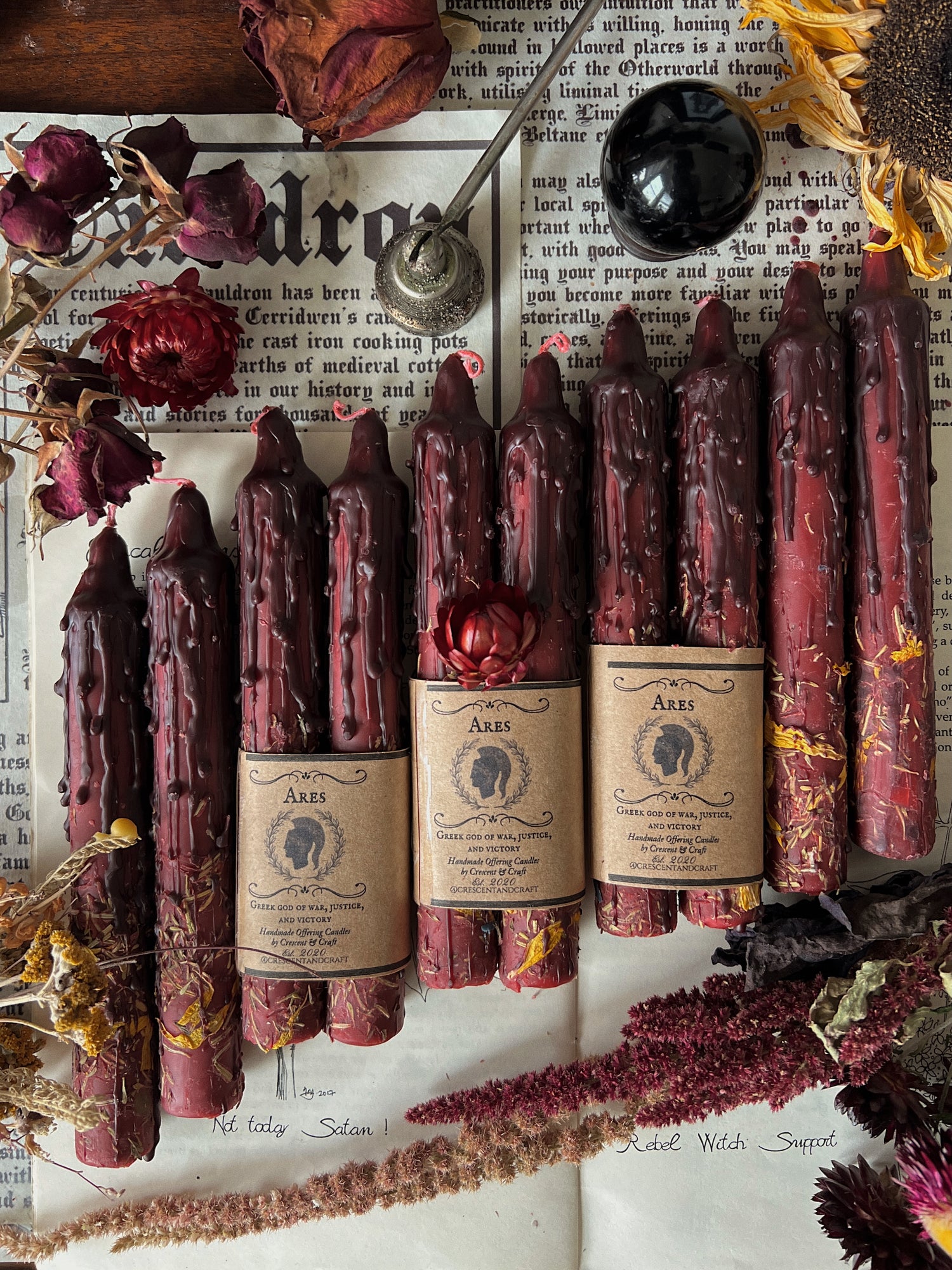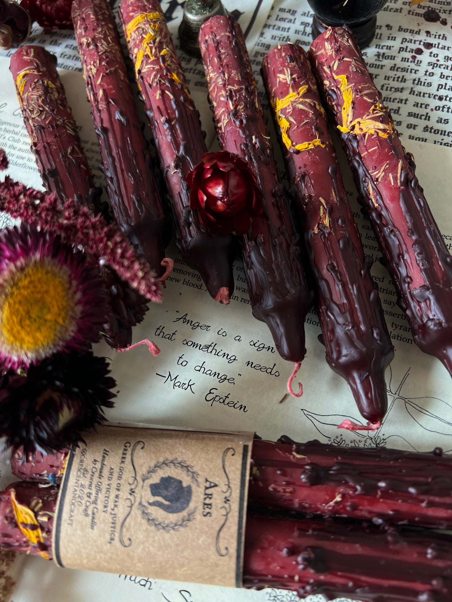 Burn these tapers outside your doors or inside your living space for protection and to and chase enemies away. He is petitioned for victory, courage, and martial skills. Be careful when petitioning Ares if you work with Athena: there’s a long grudge, competition, and jealousy between them. Keeping them near each other is said to invite fireworks.