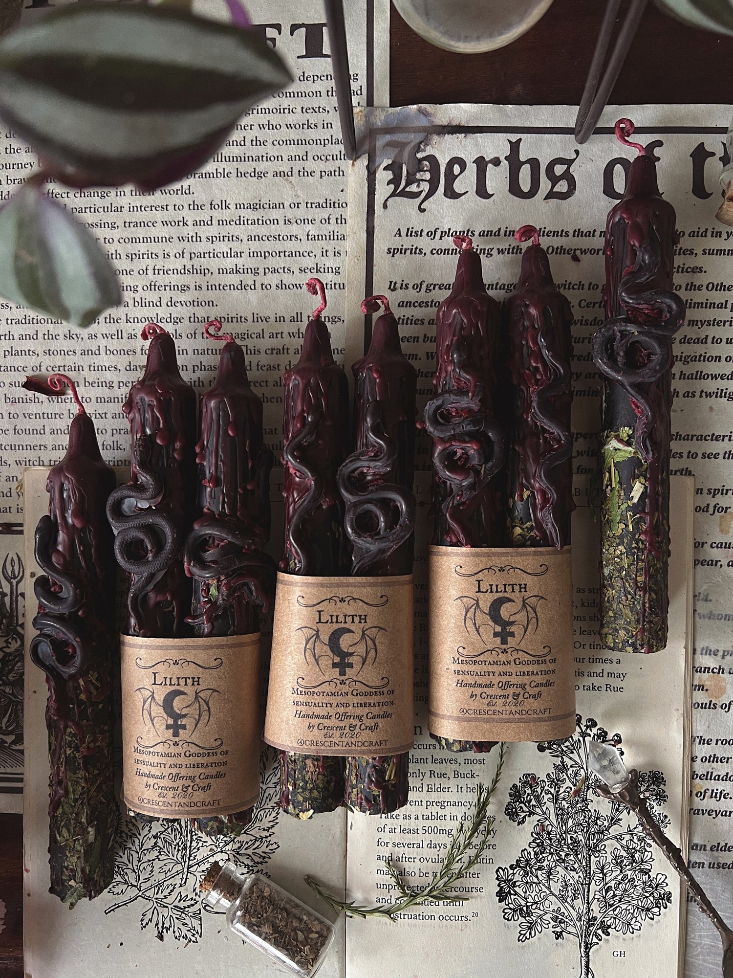 ɪᴛᴇᴍ ᴅᴇsᴄʀɪᴘᴛɪᴏɴ: Two 6 inch taper candles rolled in locally sourced herbs. These taper candles have been ritually rolled in herbs associated with Lilith such as damiana, roses, wormwood, yarrow, and apple.