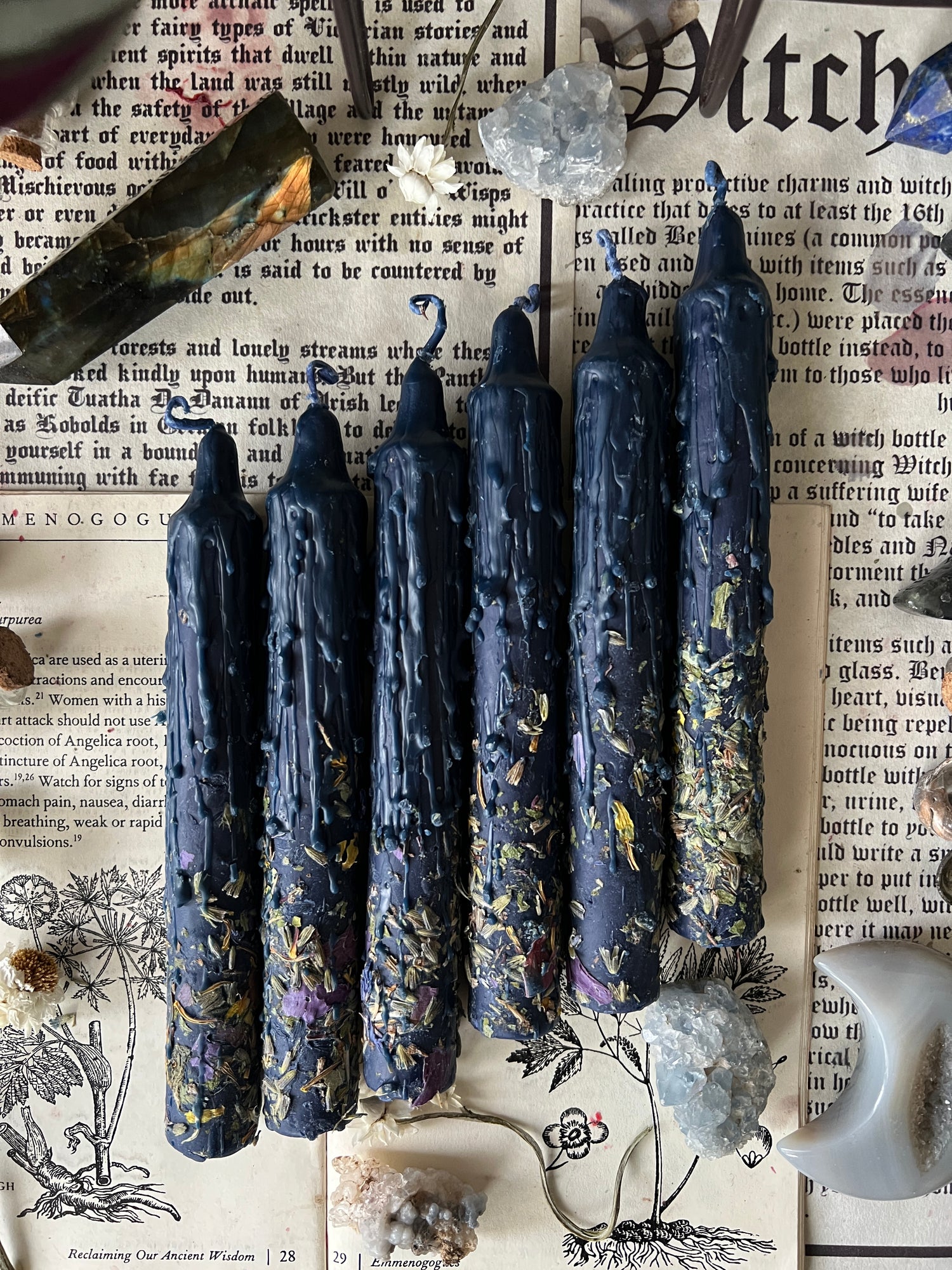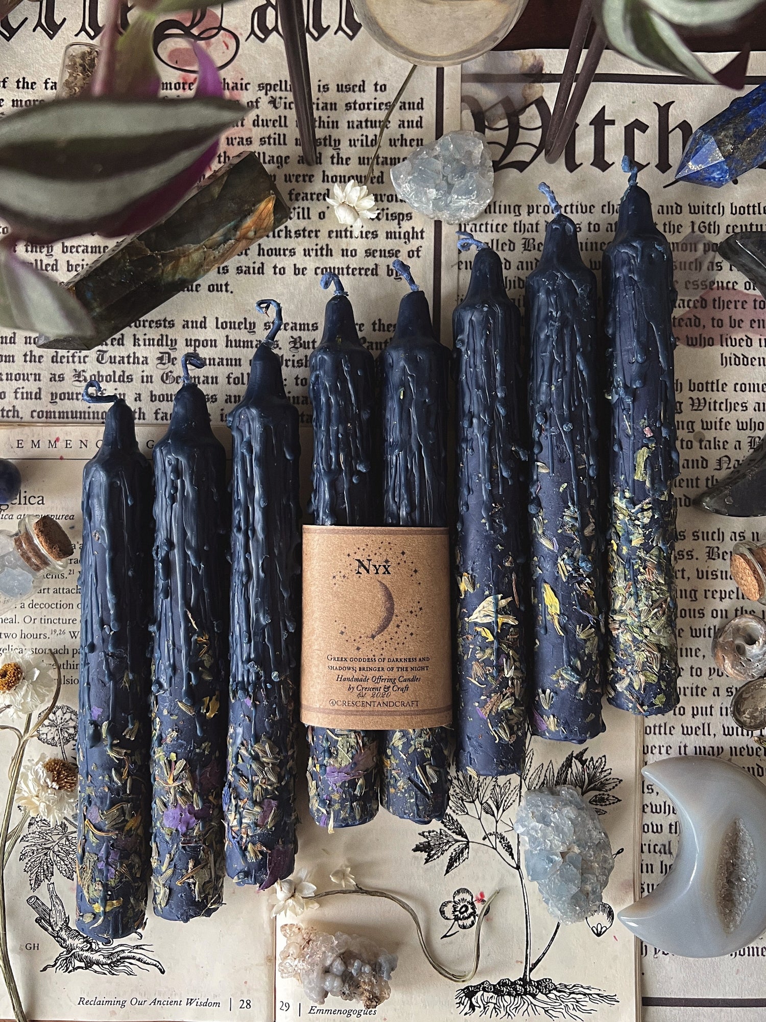 ɪᴛᴇᴍ ᴅᴇsᴄʀɪᴘᴛɪᴏɴ: Two 6 inch taper candles rolled in locally sourced herbs. These taper candles have been ritually rolled in herbs associated with Nyx such as lavender, mugwort, blue lotus, and acacia flowers.
