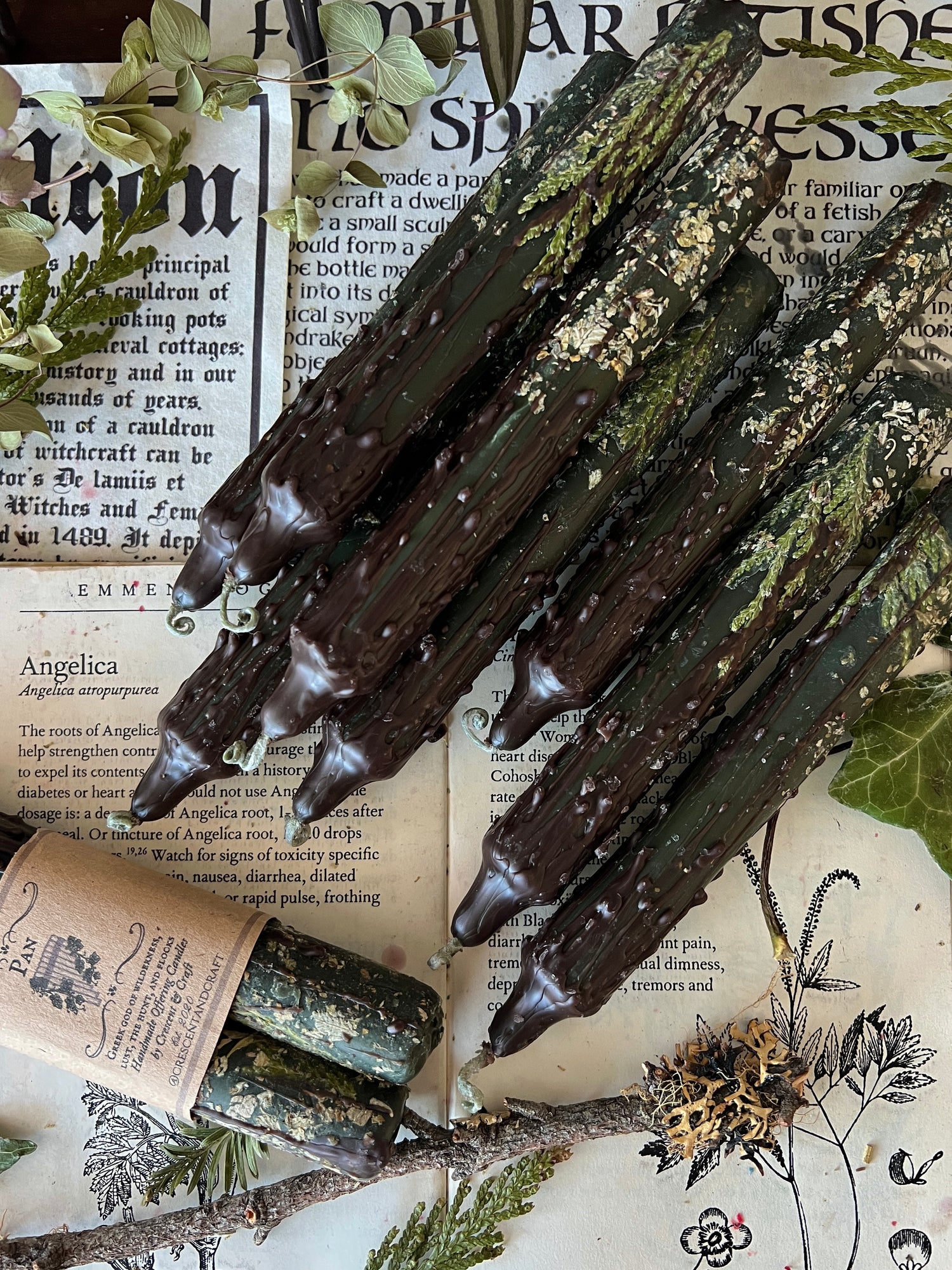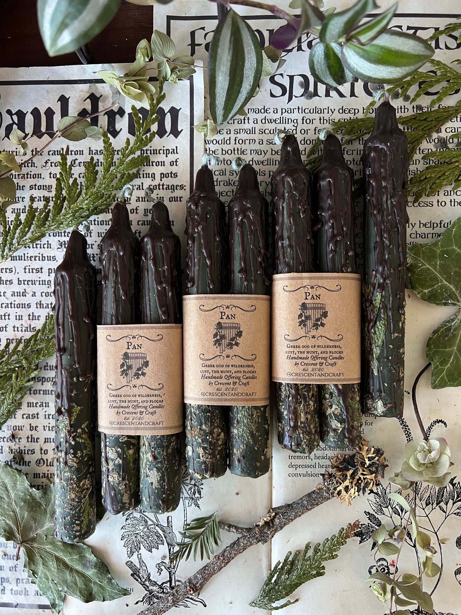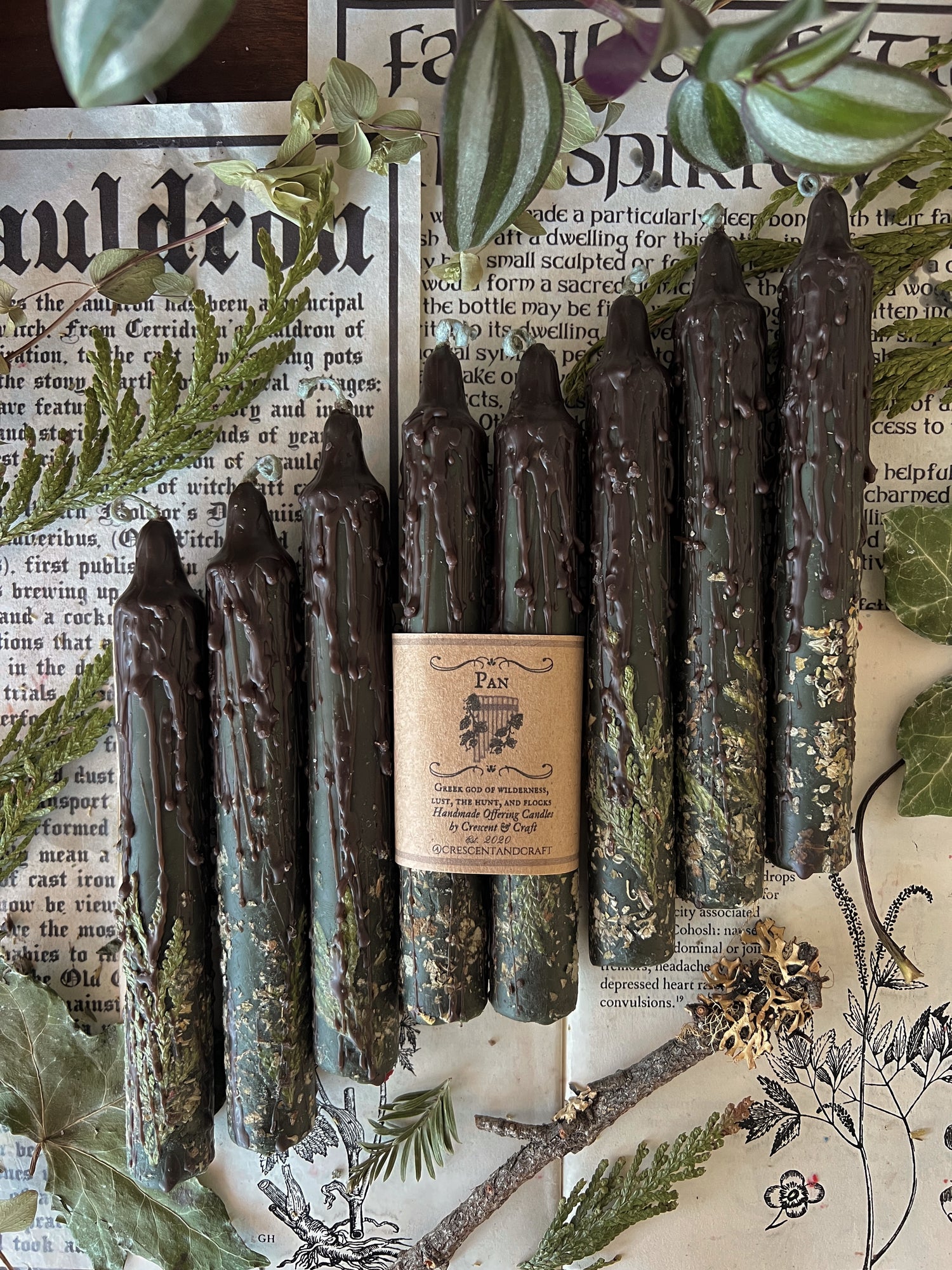ɪᴛᴇᴍ ᴅᴇsᴄʀɪᴘᴛɪᴏɴ: Two 6 inch taper candles rolled in locally sourced herbs. These taper candles have been ritually rolled in herbs associated with Pan such as pine, damiana, cedar, and sage.