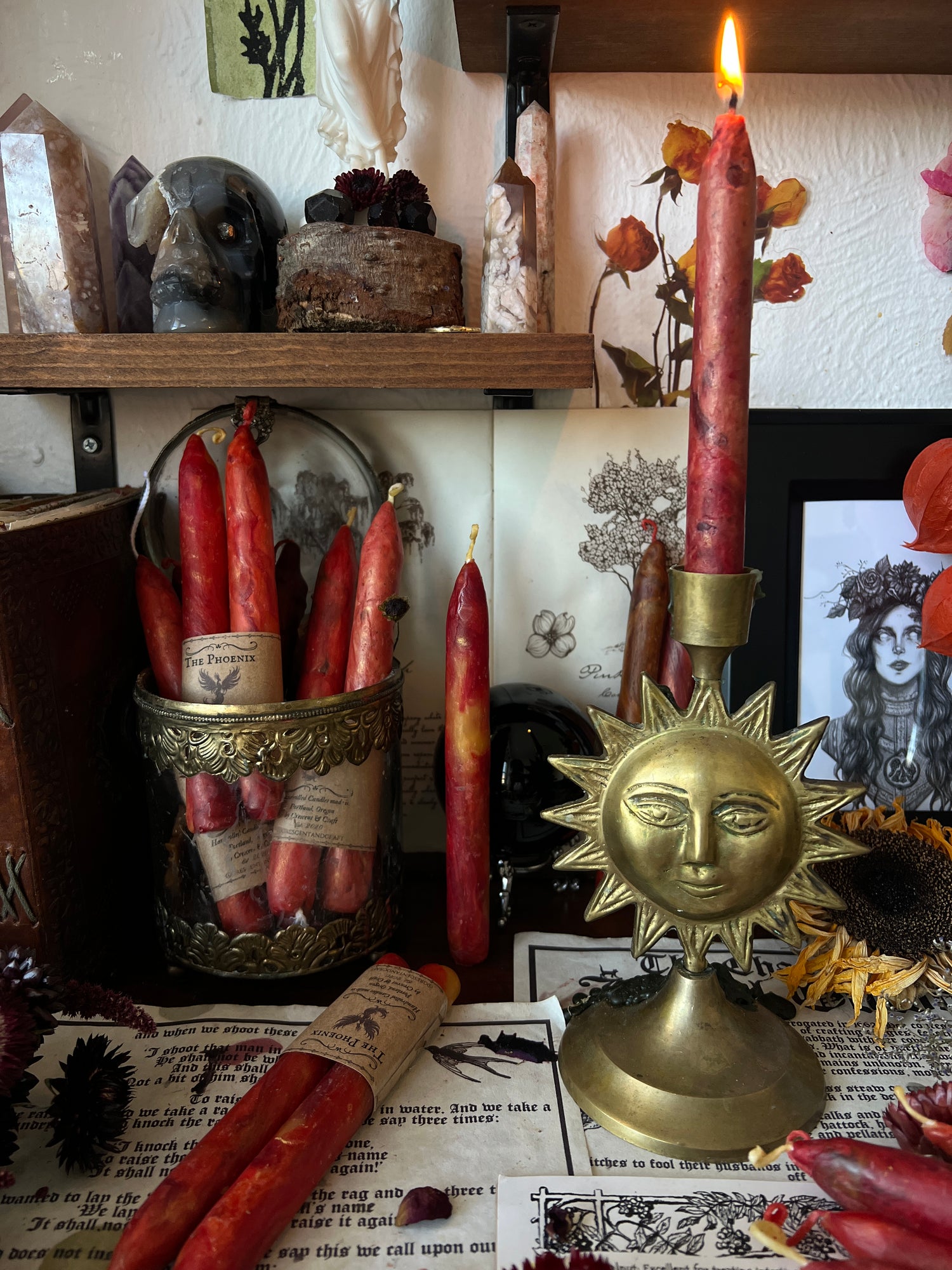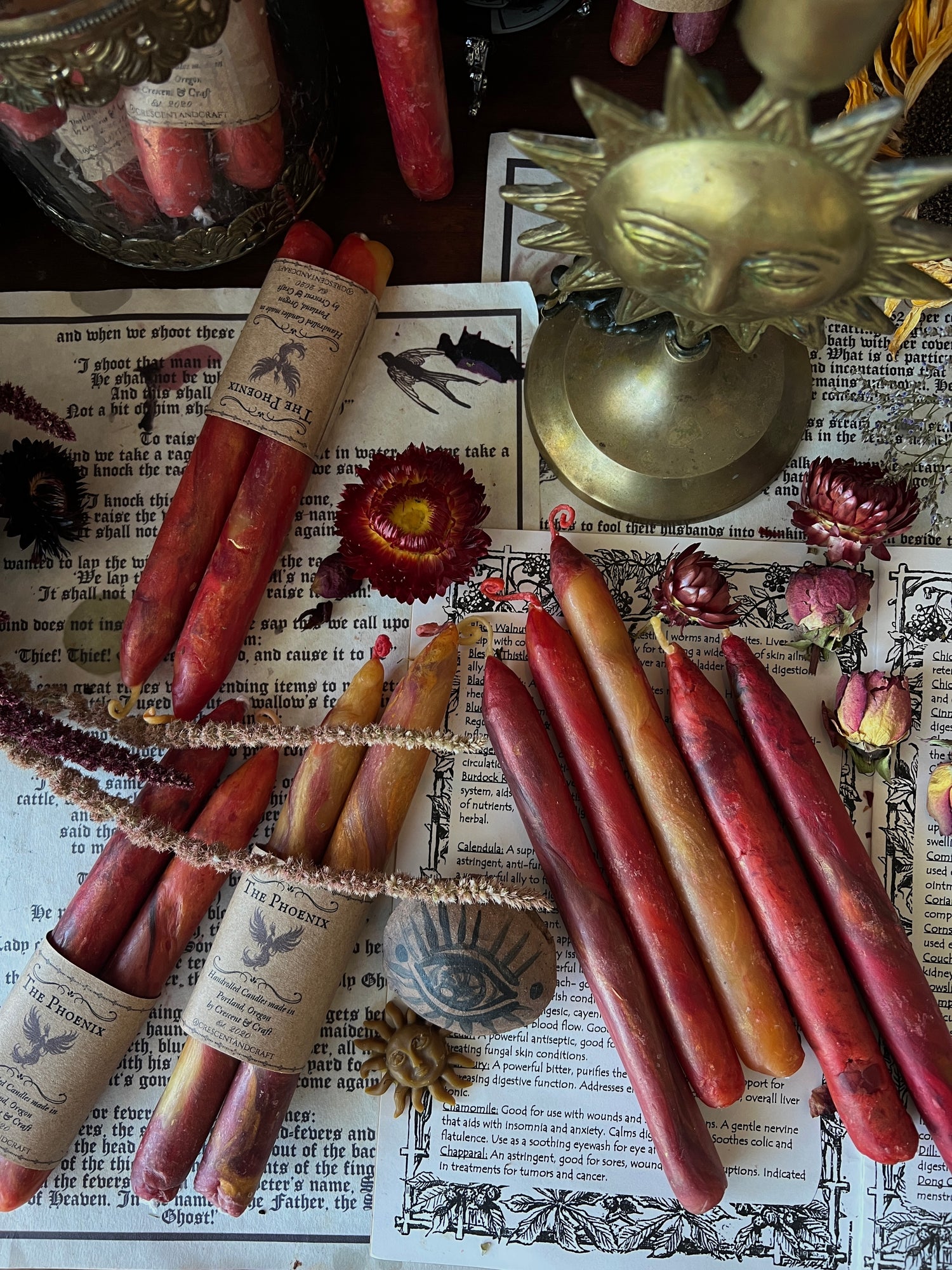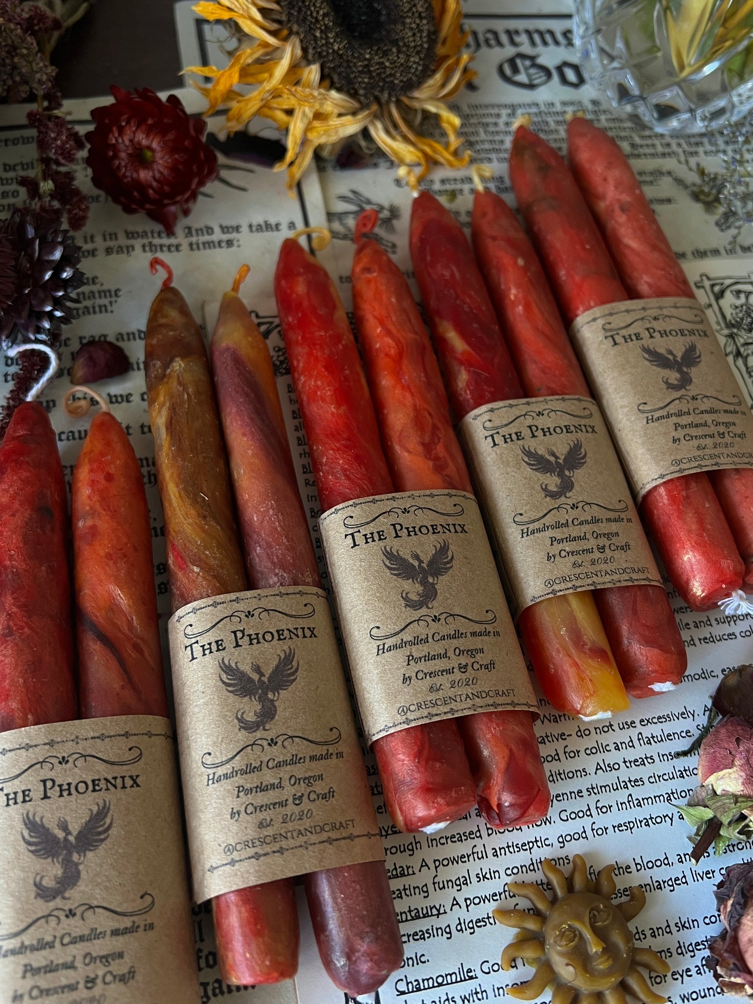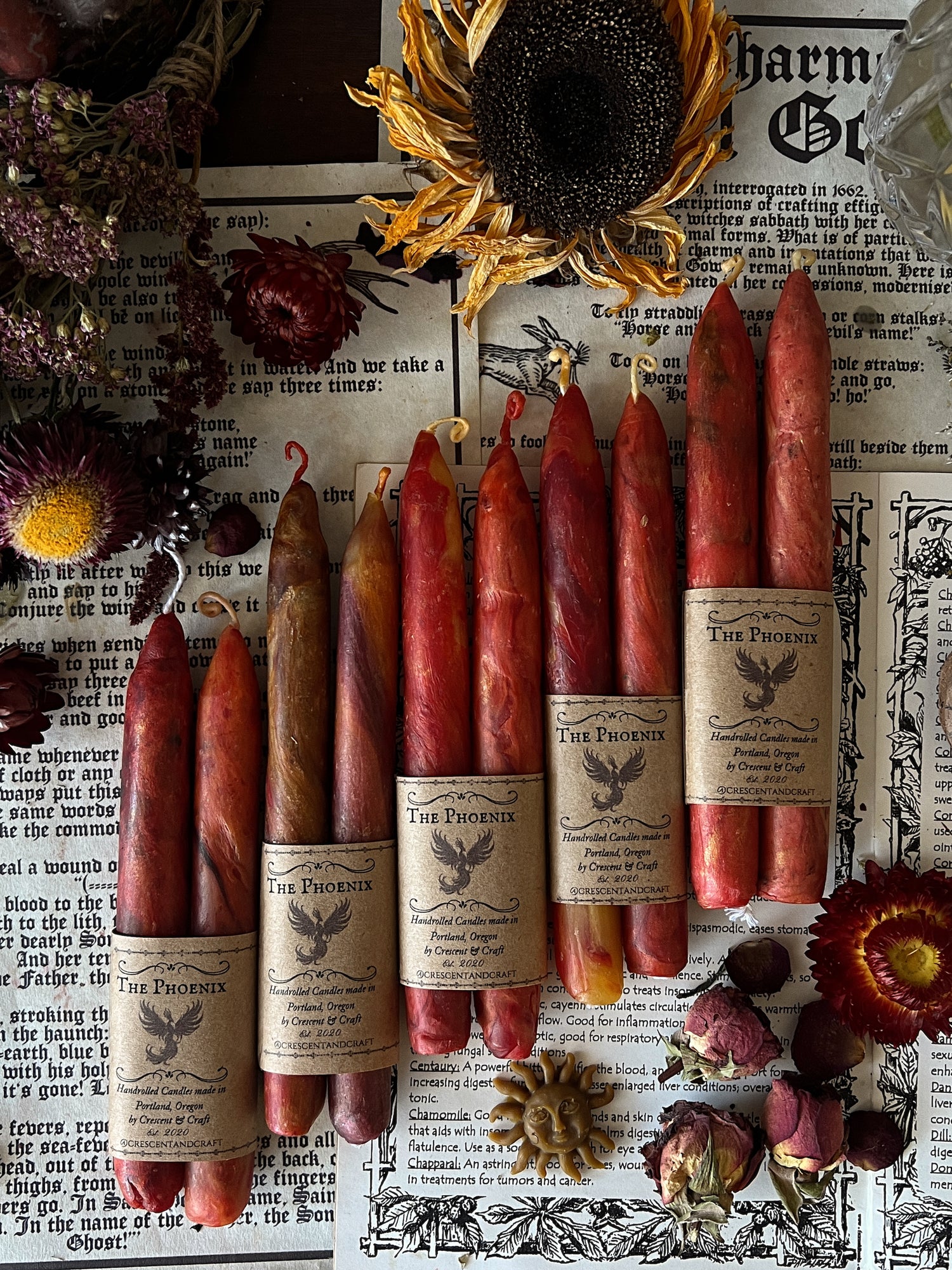 The Phoenix is the immortal bird of myth who meets her end in flames only to rise anew from her own ashes. She represents transmutation — the sacred cycle of surrender, death, and reawakening. To burn this candle is to honor transformation itself: the courage to release what has withered and the faith that new light will emerge.